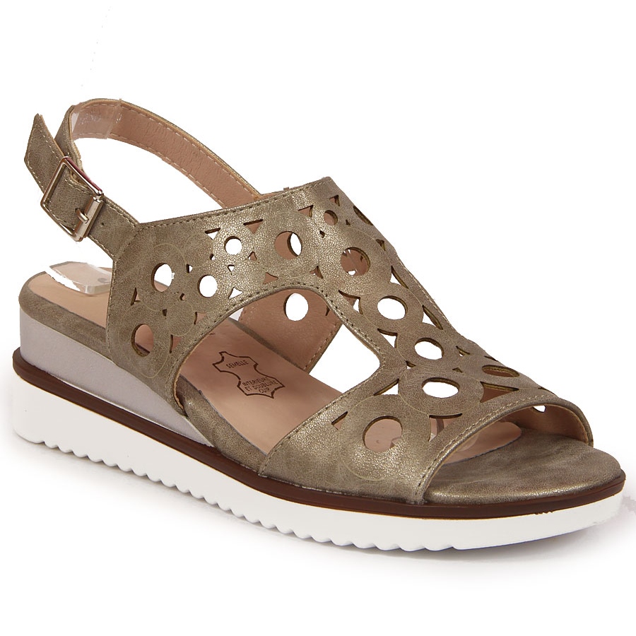 A lábbelit 5 cm magas ék jellemzi, amely vonzó megjelenést és kényelmet biztosít járás közben. Ezenkívül a 2 cm vastag talp segít elnyelni a lépéseket, és könnyedséget kölcsönöz. A kiváló minőségű anyagokból készült szandálok nemcsak esztétikusak, hanem funkcionálisak is. A cipő belseje a talpbetét természetes bőrrel, a bélése pedig ökológiai bőrrel van kidolgozva, ami hosszú viselés esetén is befolyásolja a használat kényelmét.