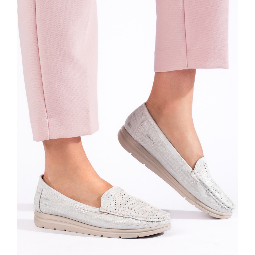 A fehér cipőknek kerek orruk van, ami finom és elegáns megjelenést kölcsönöz nekik. Az alacsony sarokú saroknak köszönhetően, amely mindössze 3 cm -re ér el, tökéletesen alkalmasak a mindennapi stilizációkhoz, és ugyanakkor tökéletesen kiegészítik a formálisabb ruhákat.