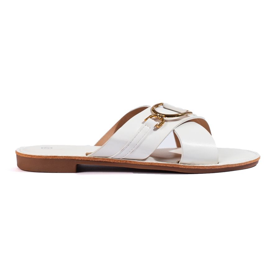 A kategória, amelyhez hozzárendelték – Alkalmi, jelzi mindennapi jellegüket. Tökéletes kiegészítői a hétköznapi, nyári stílusoknak, de klasszikus megjelenésüknek köszönhetően formálisabb körülmények között is jól beválik. Ezeknek a papucsoknak a megkülönböztető jellemzője a színük - a domináns fehér szín az arany elemekkel kombinálva kifinomultságot ad, a bézs talp pedig finoman kiegészíti az egész kompozíciót.