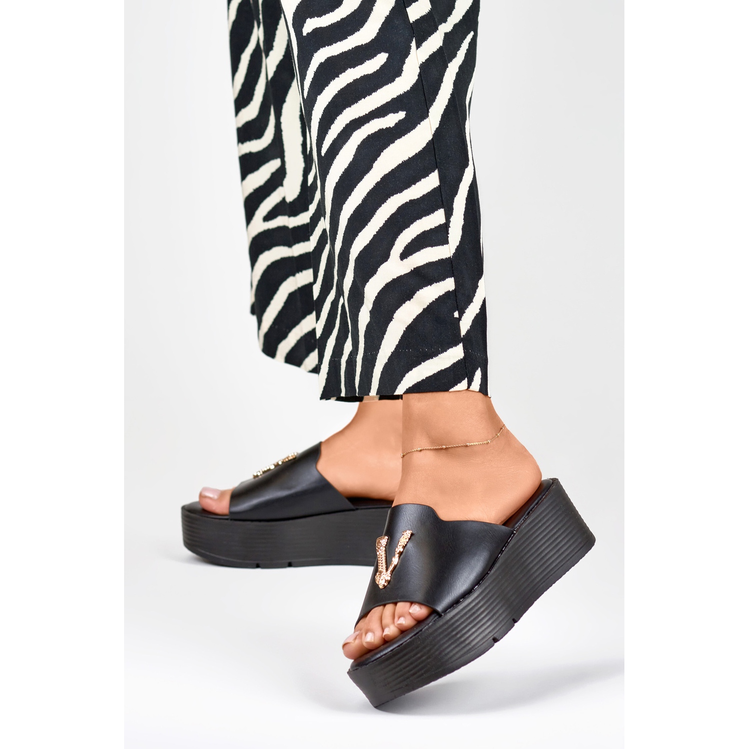 A stílusos, fekete flip -flopok a Keeshoes kollekcióból a kényelem és a divatos megjelenés tökéletes kombinációja. Kiváló minőségű ökológiai bőrből készül, lágy ökológiai bőrből és stabil ékkel, 6 cm magasságban. Az arany dísz és a finom fúvókák eleganciát adnak, amelynek köszönhetően a papucs mind alkalmi, mind kissé több kimeneti stilizációt eredményez a tavaszi/nyári szezonban.