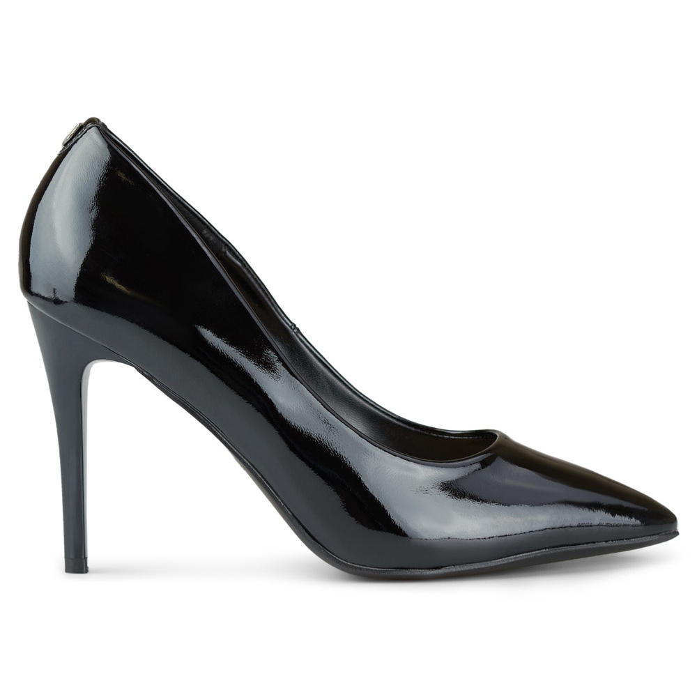 A lakkozott ökológiai bőrből készült klasszikus fekete szivattyúk egy időtlen modell, amely pompát ad mind az esti alkotás, mind az elegáns jelmez az irodában. A karcsú spitz és a magas tűs optikailag vékony a láb, a bőr talpbetét pedig kényelmet nyújt.