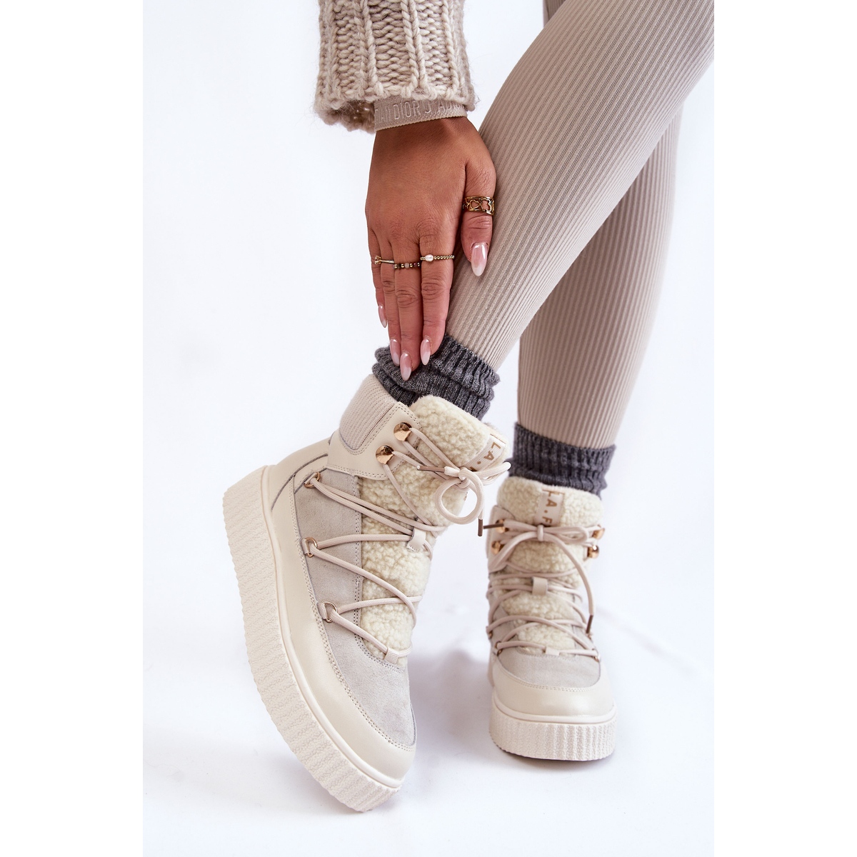 Ezt a stílusos bokacsizmát a funkcionalitás és a divatos megjelenés kombinálására tervezték. A természetes velúr és a kiváló minőségű ökológiai bőr kombinációjából készült hócsizma tartósságot és esztétikai megjelenést biztosít. A semleges világos bézs színnek köszönhetően a lábbeli tökéletesen illeszkedik a legtöbb téli stílushoz.