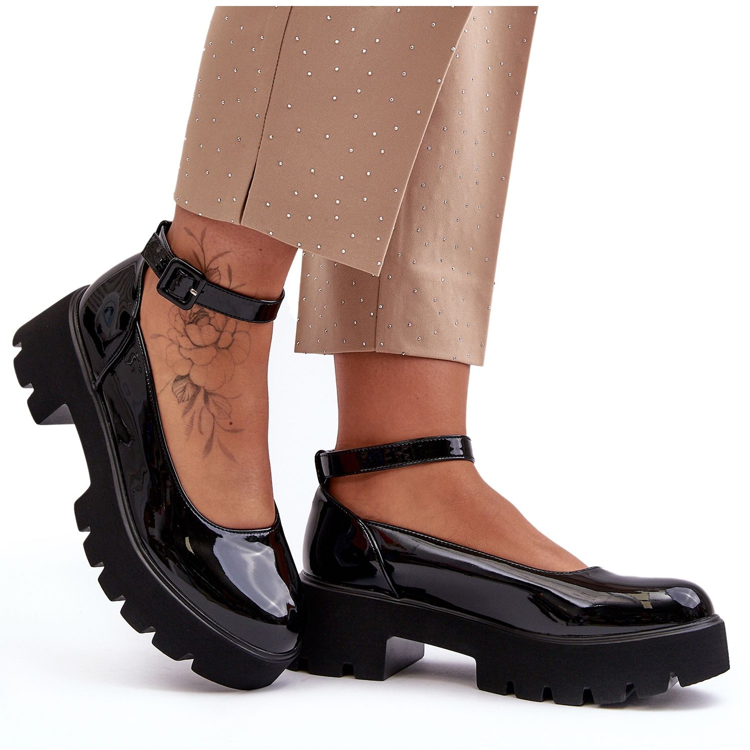 Ezek a divatos cipők kiváló minőségű ökológiai lakkbőrből készültek, ami kivételes fényt és eleganciát ad nekik. A lekerekített orrokkal, kényelmes, masszív 5,5 cm-es sarokkal és 3,5 cm-es platformpal felszerelt cipők stabilitást és kényelmet garantálnak még hosszú távú használat során is. Ezenkívül a puha eco-bőr talpbetét minden lépésnél kényelmet biztosít a lábának.