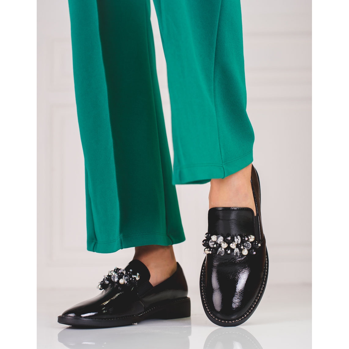 Az elegáns, fekete urak lakkozott kivitelben a klasszikusok és a modern stílus tökéletes kombinációja. A gyártótól származó modell A másik márkát a strasszok finom dekorációja különbözteti meg, amely karaktert ad túlzott ostobaság nélkül. Ezek beillesztett cipők, zárt, kerek orrú és lágyan beépített sarokú cipővel - a természetes bőr betét által biztosított kényelemmel.