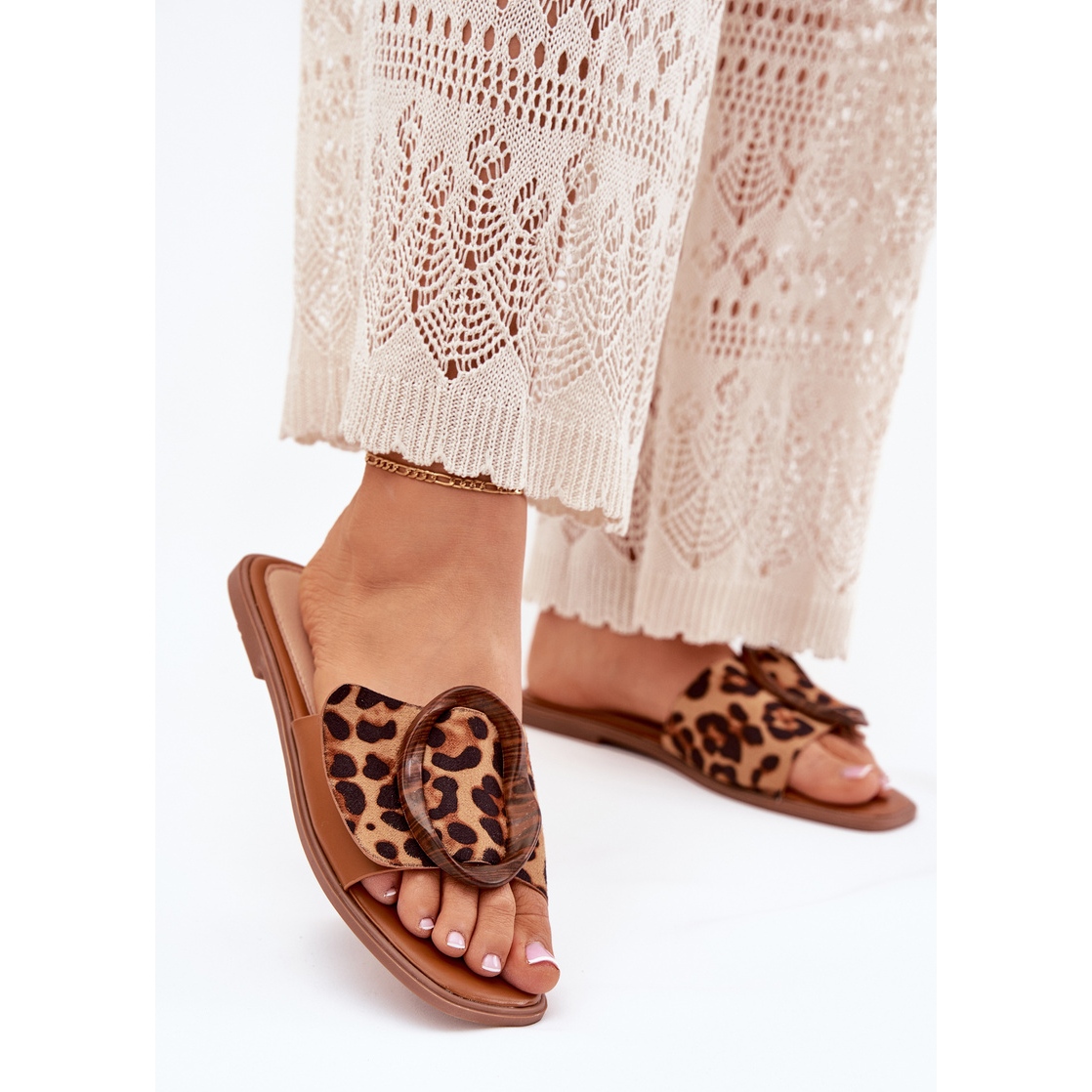 Részletek: Női lapos papucs dekoratív leopárd csatjával barna