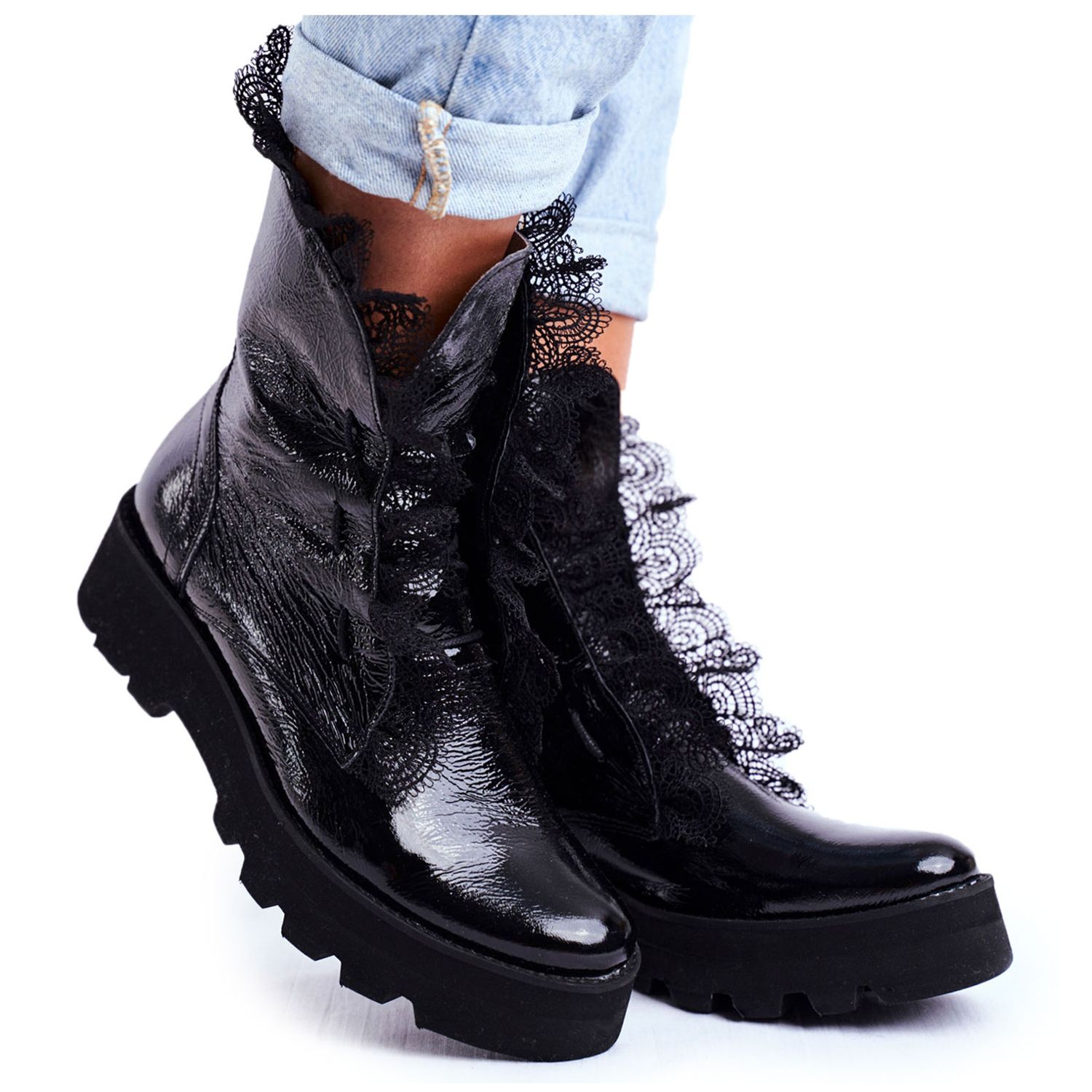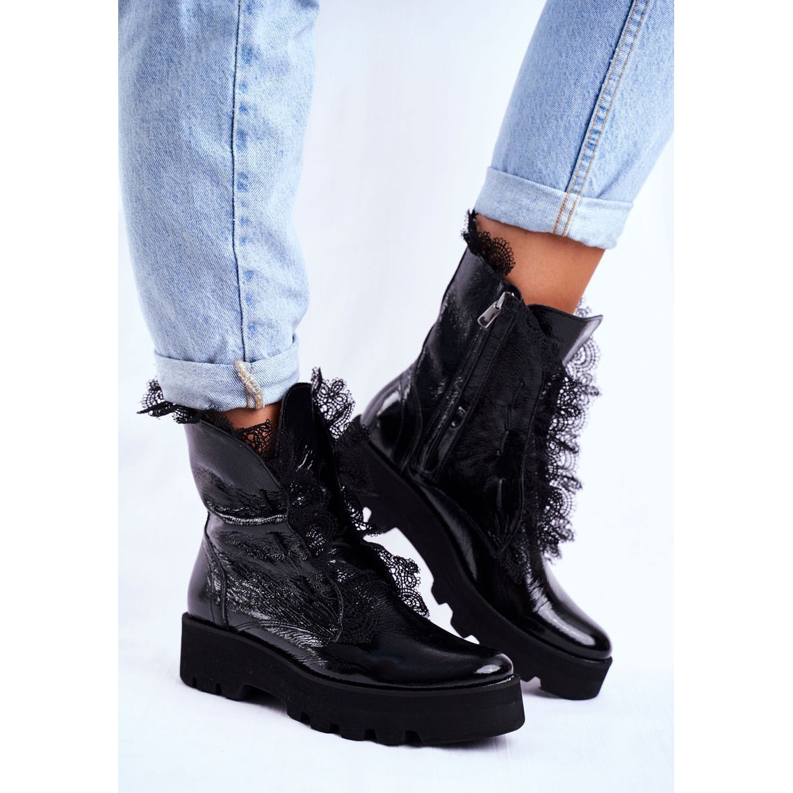A természetes lakkbőrből készült csizmák felsőrészét dekoratív csipkék díszítik, ami egyedi karaktert ad nekik. A kényelmes, természetes bőrből készült betét kiváló szellőzést és kényelmet biztosít, így akár több órán keresztül is viselheti őket anélkül, hogy kellemetlenséget érezne.