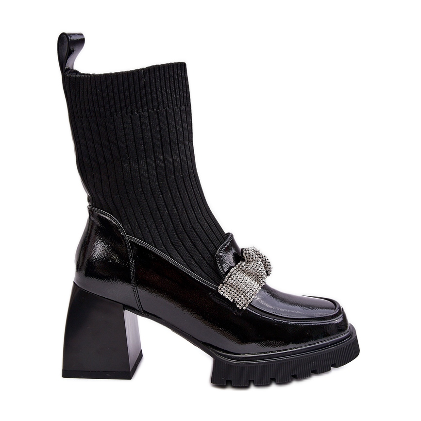 Elegáns és divatos csizmák, amelyek kombinálják a kényelmet a stílussal. Kiváló minőségű ökológiai bőrből készül, rugalmas felső, zokni formájában, ráncos övvel díszítve, fényes strasszokkal. Tökéletes az őszi/téli szezonhoz-A szigetelt betéthöz biztosítja a hő kényelmet, és a stabil sarok-Klocek bizonyosságot ad.