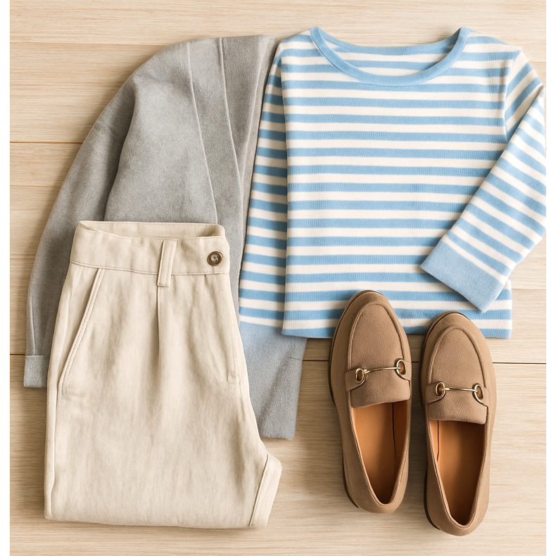 A barna velúr mokaszinok fenomenálisan néznek ki világos vászonnal. Párosítsd hozzájuk az ekrü vászonnadrágot és a kék és fehér árnyalatú csíkos pulcsit. Dobj egy szürke kardigánt a válladra, és élvezd a kényelmes, mégis stílusos ruhát. Ne felejtsen el hasonló tónusú kiegészítőket választani, és kerülje a túl sok kontrasztos színt. A tavasz finomsága a kiegészítők kiválasztásánál is finomságot igényel.