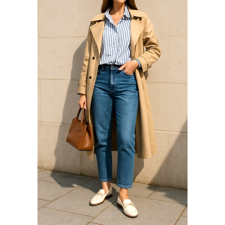 Viseljen fehér vagy krémszínű bőrcipőt klasszikus, egyenes szabású kék farmerrel. Kombináld őket egy csíkos inggel és egy bézs színű trench-kabáttal, így a párizsi elegancia jegyében hozd létre a stílust. Ez a megjelenés tökéletes egy városi sétához, barátokkal való találkozáshoz vagy vásárláshoz. A fényes naplopók optikailag meghosszabbítják a lábakat, és könnyedebbé teszik az egész megjelenést.
