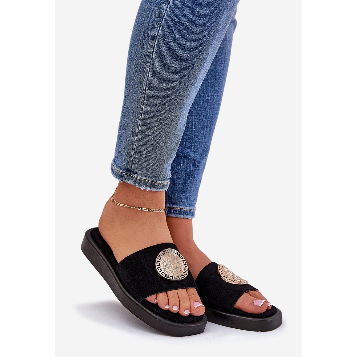 Fedezze fel az egyedi női papucsot, amely elegáns fekete színű arany dekorációval, amelyek a stílus és a kényelem ideális kombinációja. Kiváló minőségű öko velúrból készülve, ezeket a papucsot kényelmes 2 cm -es magas platformon állítják be, ami nagyszerű választást jelent mind a nyári esti kirándulásokhoz, mind a mindennapi alkalmi stilizációkhoz.