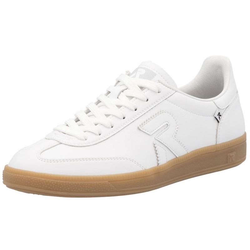 A Rieker W2200 fehér cipő egyesíti a sportot és az alkalmi stílust, ami sok stílushoz ideális kiegészítést jelent. A kerek orr és az alacsony kivitel modern karaktert ad nekik, és a bézs talp jól ellentétes a fehér felsővel, és harmonikus egészet hoz létre.
