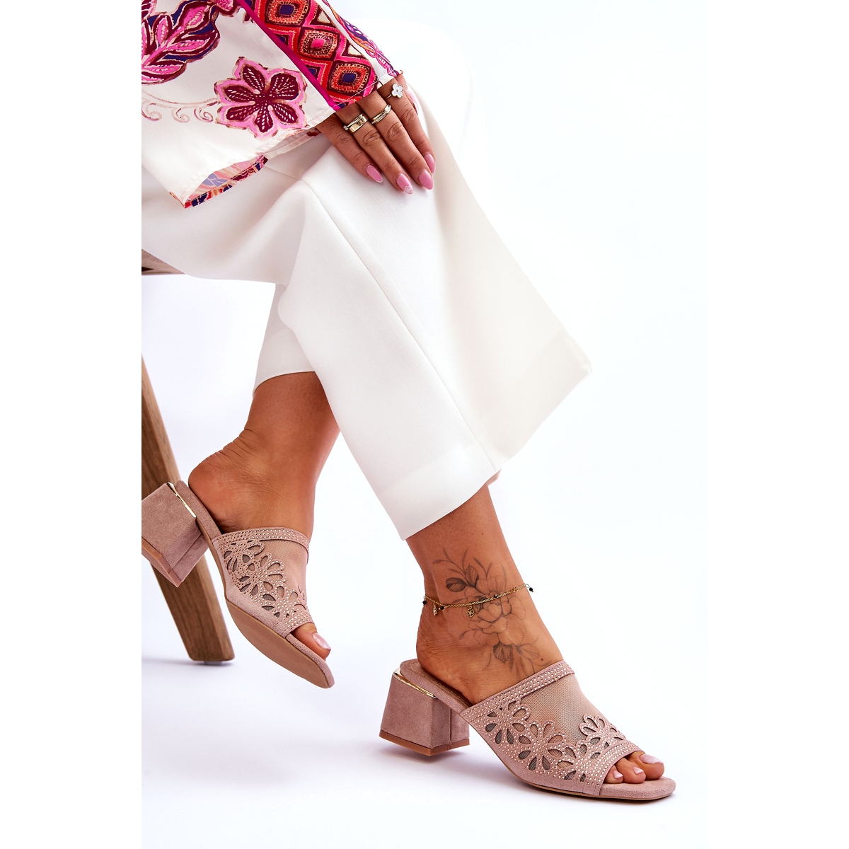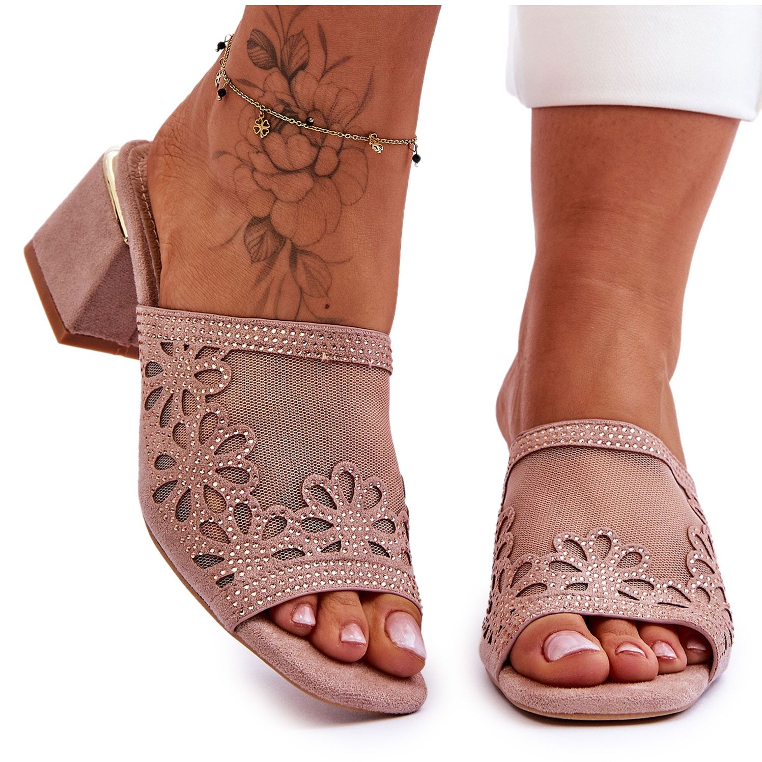 A termék egy S.Barski által gyártott, KV-612-1 típusú, bézs színű női magassarkú papucs, amelyet a gyártó Nude néven ír le. A cipő vége nyitott orrú, a klasszikus flip-flop stílusnak megfelelően. A felsőrész puha, öko-velúr bőrből és hálós anyagból készült, áttört virágokkal és strasszokkal díszítve. A természetes bőr talpbetét kényelmes viseletet biztosít. A 6 cm magas tömbsarok eleganciát ad, miközben biztosítja a stabilitást. A terméknek nincs meghatározott domináns mintája.
