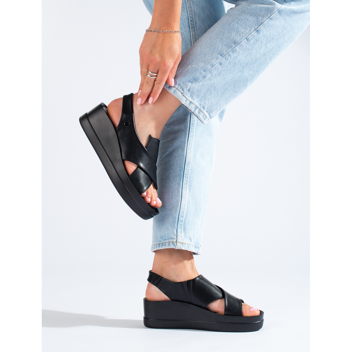 Elegáns női Shelovet ékszandált kínálunk klasszikus fekete színben - minden alkalomra tökéletes kiegészítő. Nyitott sarokkal és orr nélkül ezek a szandálok tökéletesek a meleg napokra, kényelmet és stílust biztosítva.