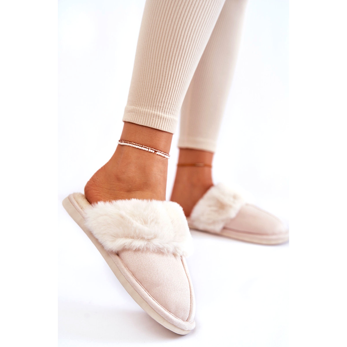 Női sima papucs szőrrel - világos bézs