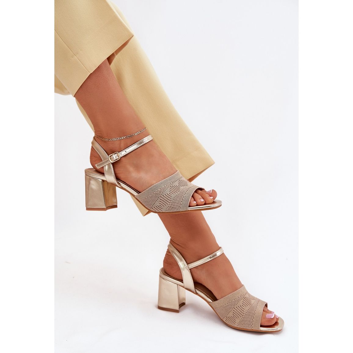 Bemutatjuk az elegáns női szandált a bár sarkán, kellemes arany színű. Ezeket az egyedi szandálokat kiváló minőségű öko -bőr és textil anyag kombinációjából készítették, ami stílusos és kényelmes viseletéből is.