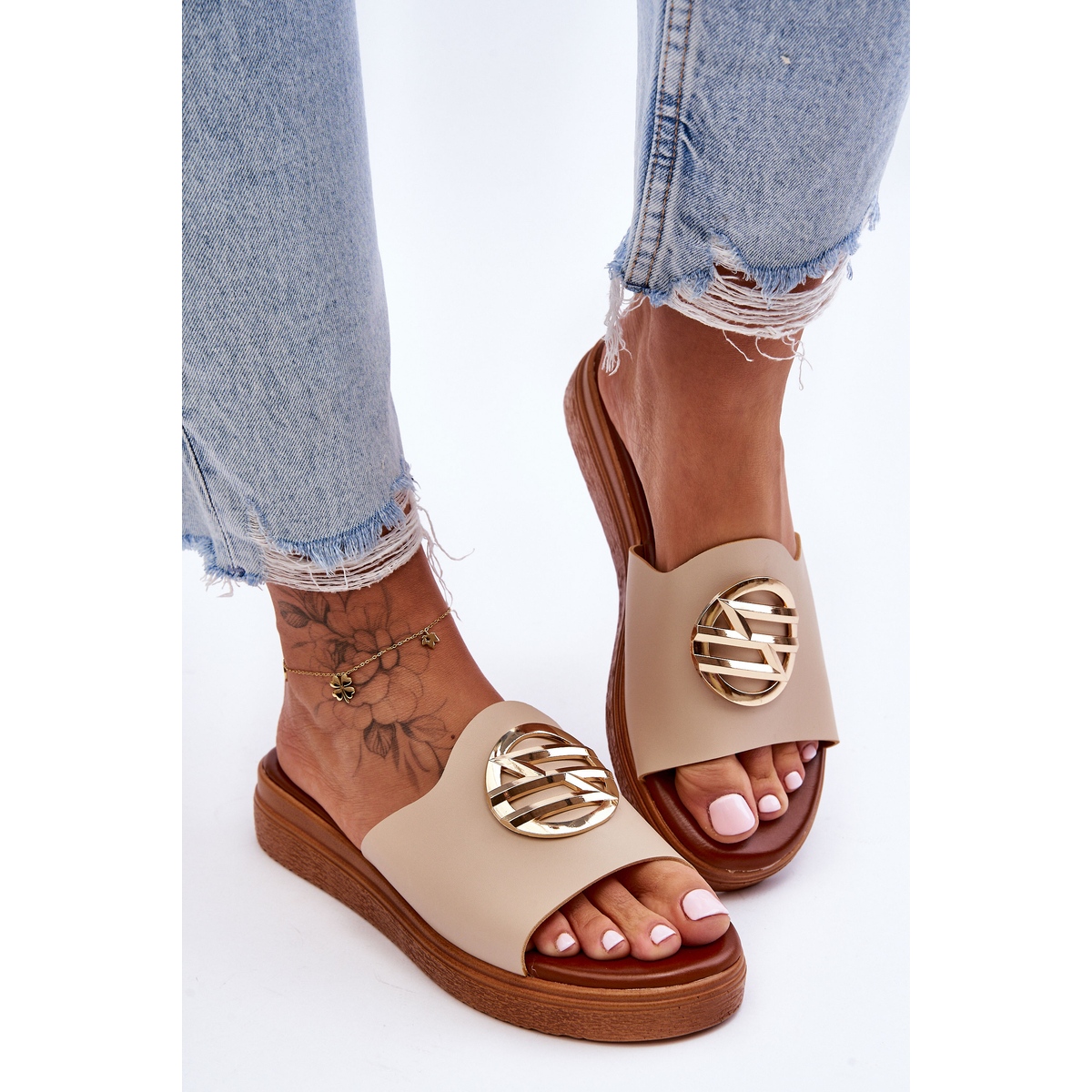 Egyedi akcentus a cipő elején elhelyezett díszítés - elegánsan elkészített arany színű műanyag részletek, amelyek minden lépéshez egy kis fényt és exkluzivitást adnak. Függetlenül attól, hogy sétát tervez a városban, vagy barátokkal találkozik, ezek a papucsok biztosan felkeltik a figyelmet.