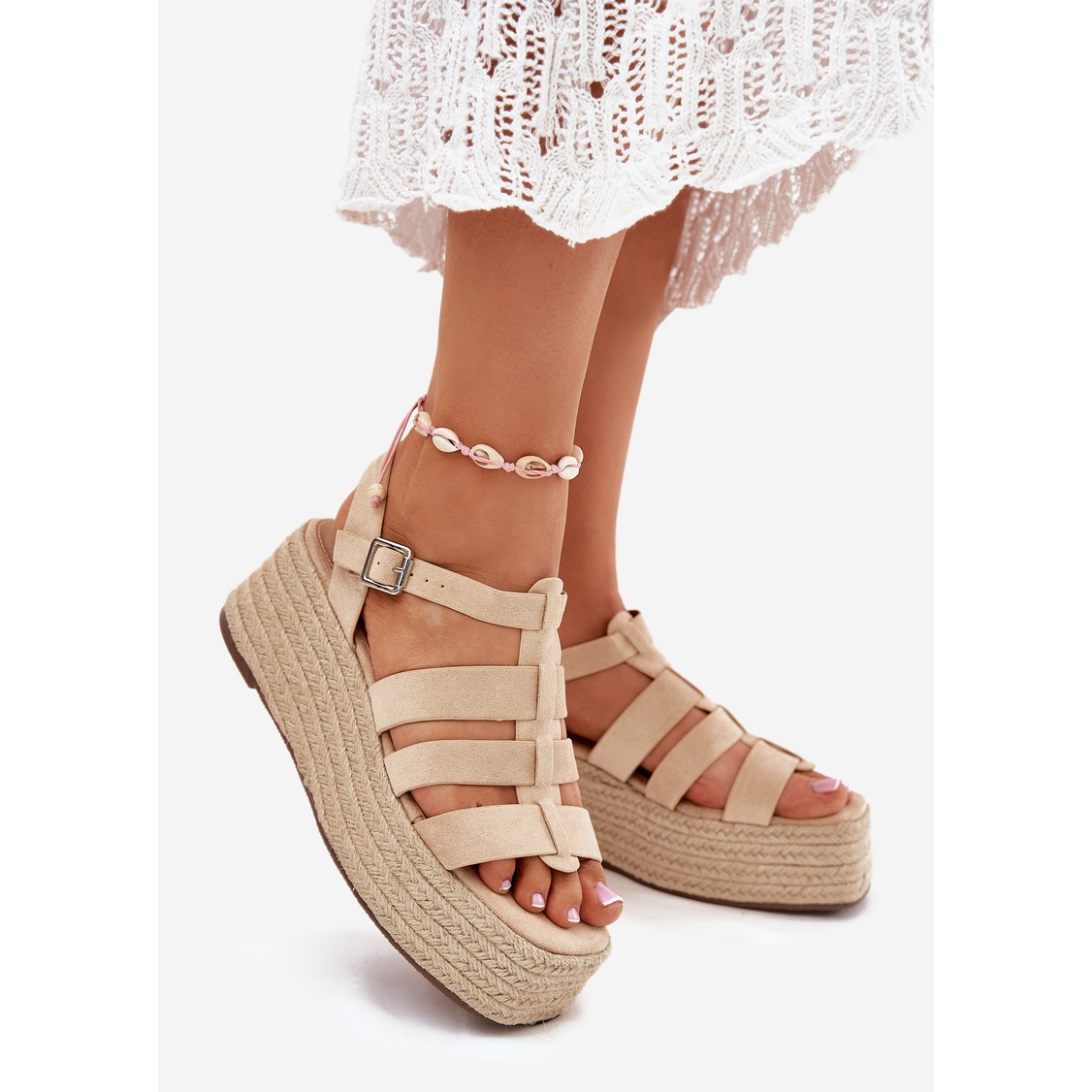 Fedezze fel a nyári eleganciát, köszönhetően a Bige női szandálnak, csíkokkal és zsinórral. Kiváló minőségű öko velúrból készültek, ezek a szandálok nemcsak stílusos megjelenést kínálnak, hanem egyedi vigasztalást is. Beállítva egy finom, 7 cm -es magas ékkel rendelkező platformon, ideális kombinációja a finomság és a stabilitás, ami azt jelenti, hogy a nap folyamán minden lépést élvezhet.