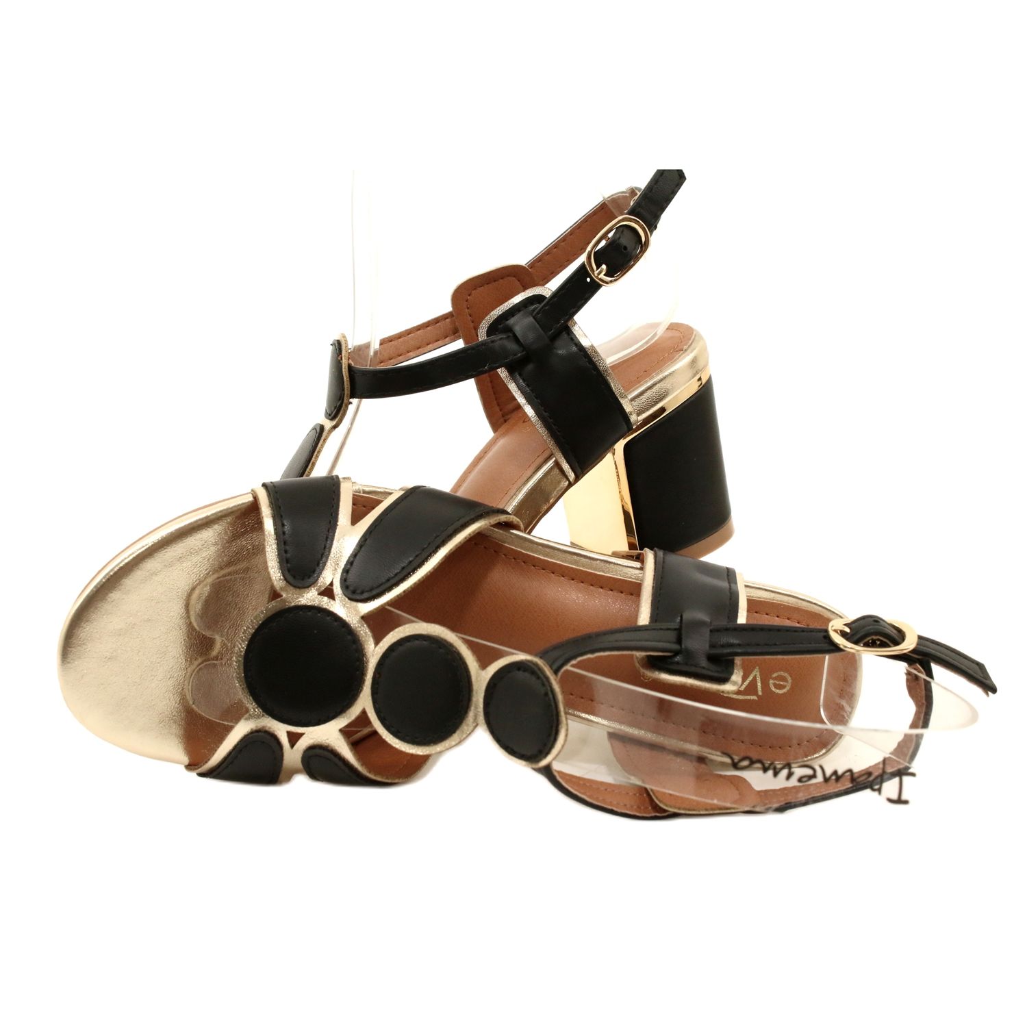 Elegáns, klasszikus szandál, amely stílust ad minden stílushoz. Kiváló minőségű ökológiai bőrből készül, kényelmes ökológiai bőr betéttel, fekete és arany látványos kombinációjában. A 7 cm -es magas oszlop nőies megjelenést biztosít, miközben megőrzi a stabilitást és a kényelmet. A nyitott elülső és a dekoratív felső univerzális vágást hoz létre, ideális mind az ünnepélyes kijárathoz, mind a mindennapi használathoz.