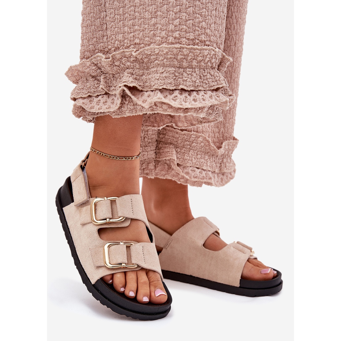 A 3 cm -es magas platformnak köszönhetően a szandálok sétáláskor kényelmet nyújtanak, és ugyanakkor világossá teszik az ábrát. A tépőzáras rögzítés lehetővé teszi, hogy tökéletesen illeszkedjen a lábhoz, ami növeli a használat kényelmét. Ezenkívül az arany csatok finoman hangsúlyozzák az egészet, és egyedi varázst adnak a szandálnak.