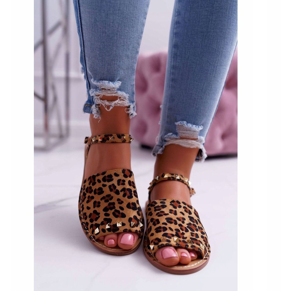 A szandálokat egyedi állatminta jellemzi, amely vonzza a tekintetet, és karaktert kölcsönöz minden stílusnak. A kiegészítő díszítések szegecsek formájában érdekes akcentust jelentenek, amely tökéletesen illeszkedik az aktuális divatirányzatokhoz. Ökológiai velúrbőrből készültek, nem csak esztétikusak, de környezetbarátak is.
