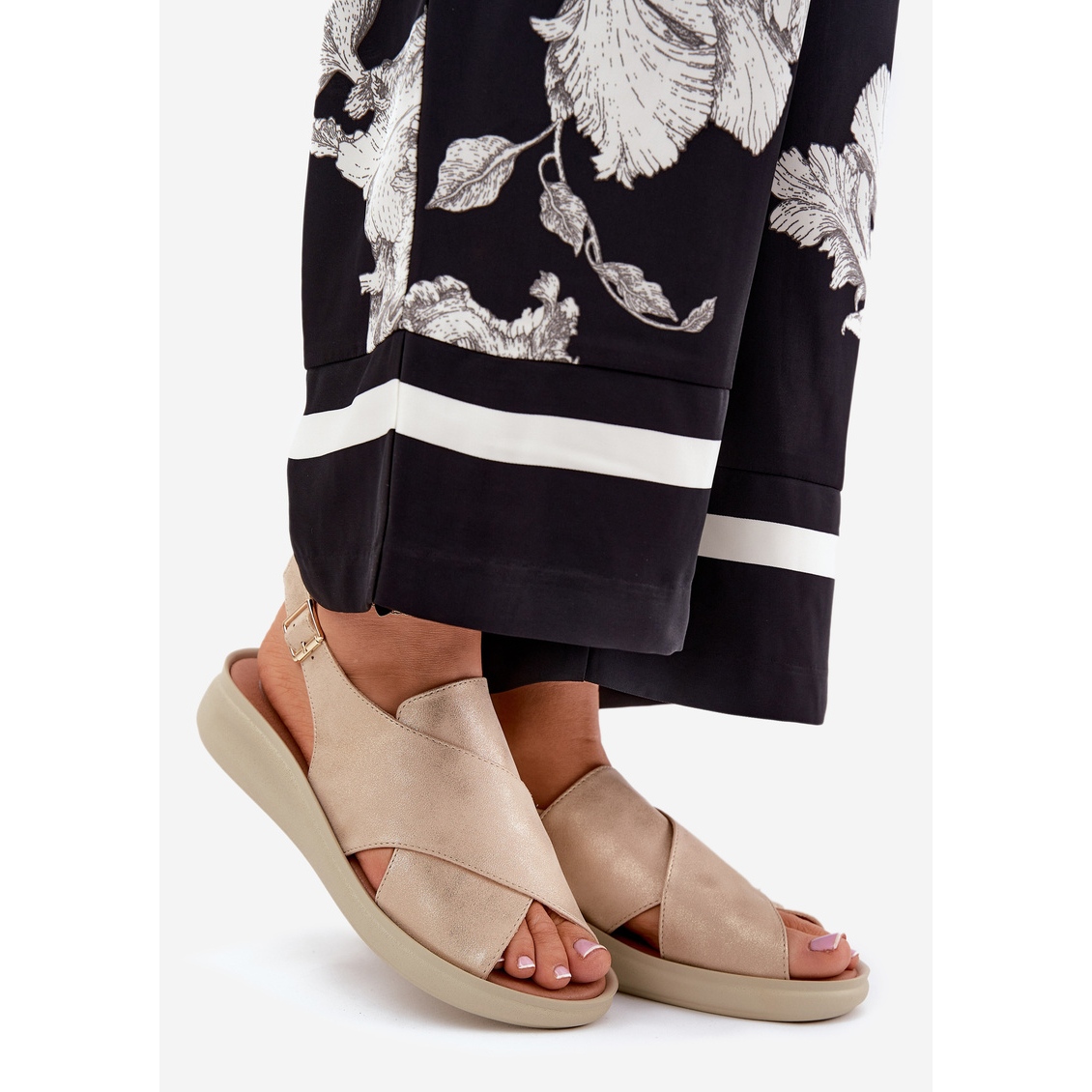 Az arany színű arany jezzi szandál nagyszerű választás a nyári napokhoz, amelyek ötvözik az eleganciát és a kényelmet. A magas színvonalú öko bőrből készült, és nemcsak stílusos megjelenést nyújtanak, hanem a viselkedés kényelmét is. A 4 cm magasságú finom ékre állítva garantálják a stabilitást sétáláskor, ami ideális társsá teszi őket egy séta és a nagyobb kijárat során.