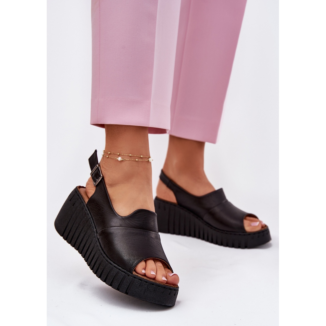 Ezt a modellt egy állítható hevederrel rendelkező szorítóval rögzítik, amely tökéletesen illeszkedik a lábhoz, biztosítva a maximális kényelmet. Egy 7 cm -es magas pad, amely beágyazódik egy stabil és kényelmes, hornyokkal ellátott platformon, lehetővé teszi, hogy egész nap szabadon mozogjon, és hozzáadja a stilizálás finomságát.