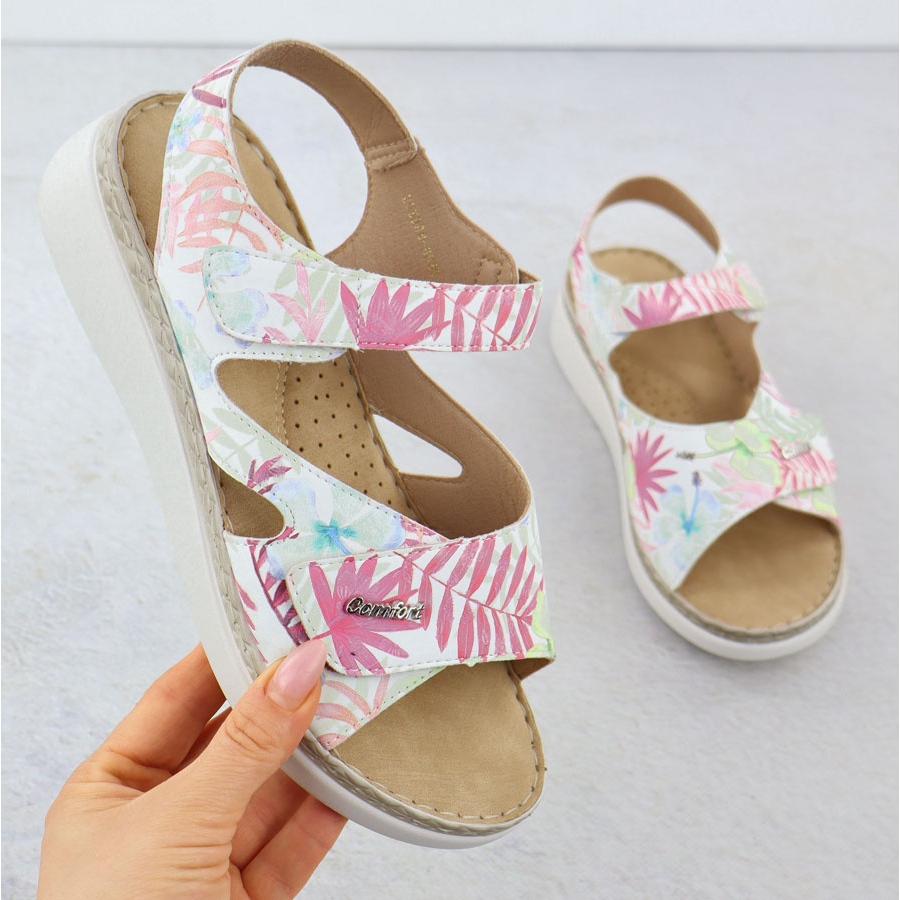 A virágminta fehér alapon könnyű és frissességet ad nekik, és a 2 cm és 4 cm ékmagasság egyetlen vastagsága sok órán keresztül biztosítja a kényelmet. Ökológiai bőrből készült szandál nemcsak esztétikai, hanem környezetbarát is. A lágy ökológiai bőrbetét gondozza a lábak kényelmét, és a tépőzáras rögzítőelem megkönnyíti az egyéni igények felvetését és alkalmazkodását.