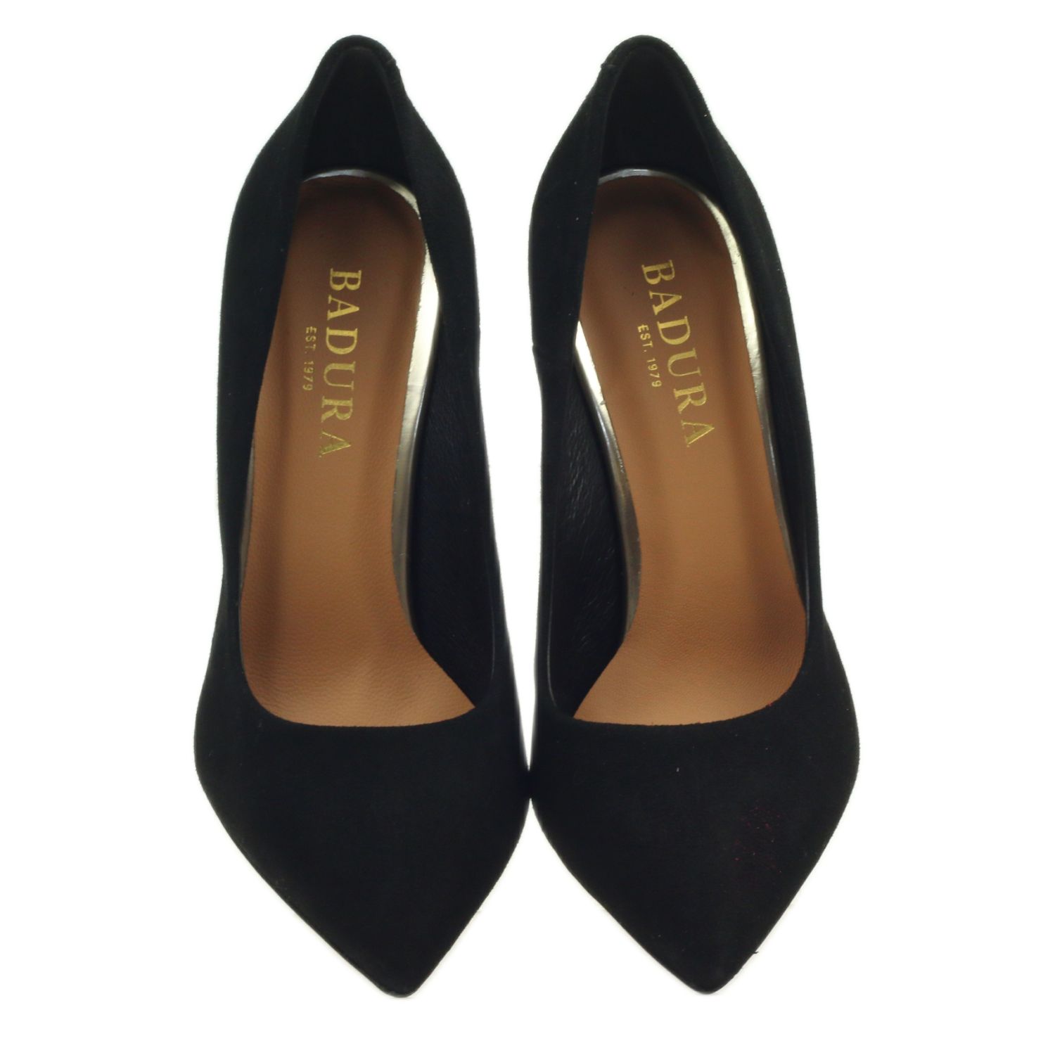 A Badura 2569 fekete női pumpák tökéletes választás azoknak a nőknek, akik az eleganciát a kényelemmel szeretnék ötvözni. A híres lengyel Badura márka kollekciójából származó könnyű cipőket 10,5 cm-es tűsarkú jellemzi, amely kiemeli az alakot, és elegánssá varázsol minden stílust. A legjobb minőségű természetes nubuk bőrből készült pumpák minimalista dizájnjukkal és finom, finom hegyes orrukkal gyönyörködnek.