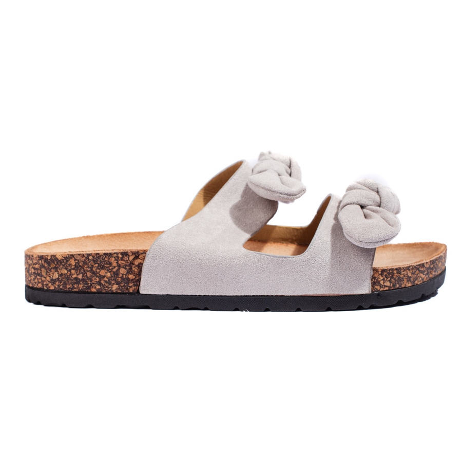 Az ökológiai velúr bőrből készült külső anyag finomságot és eleganciát ad, és nyitott sarkuk és orrhiányuk a tökéletes választás a meleg napokon. A szürke szín egy elegáns akcentust vezet be, amely tökéletesen megy az alkalmi stilizációkkal. Ezenkívül a papucsot bájos íj díszíti, amely egyedi karaktert ad nekik.