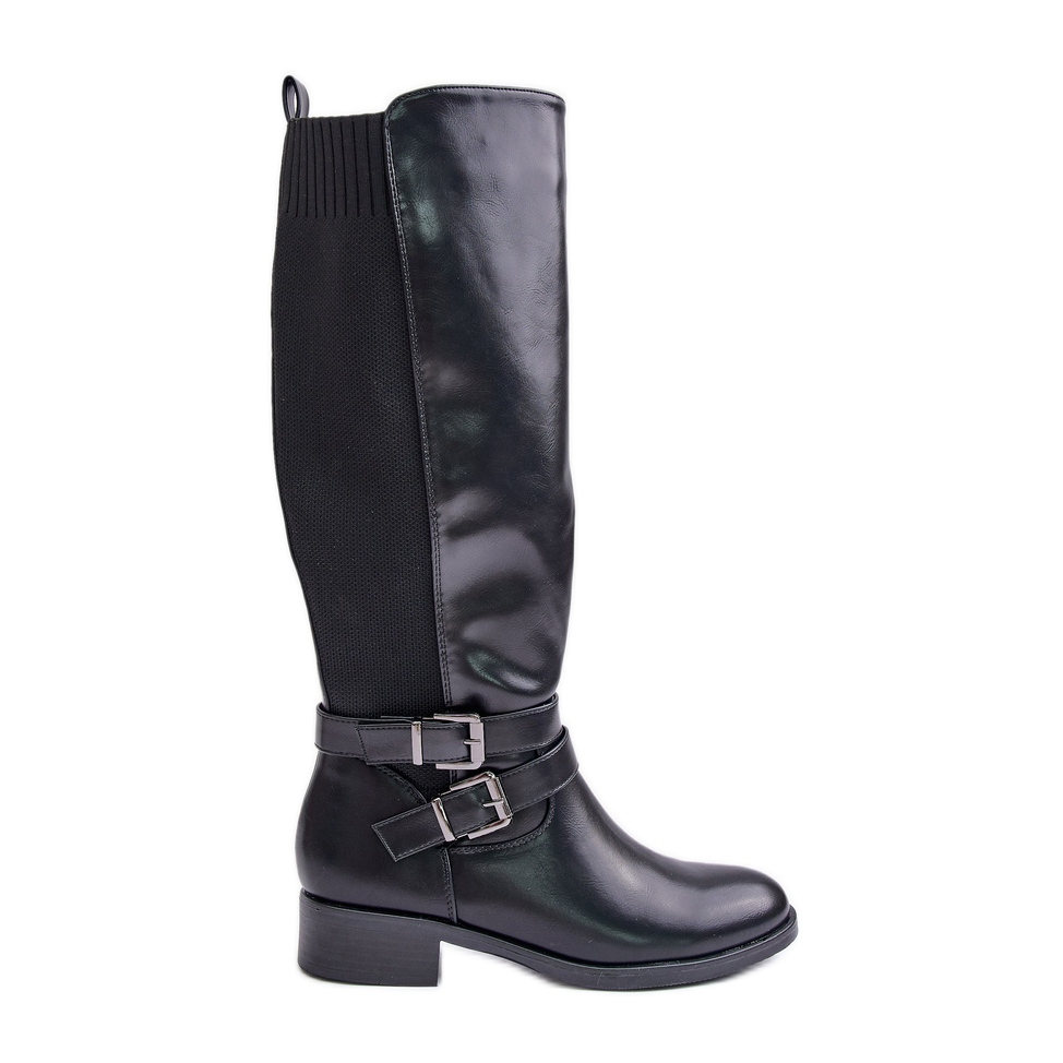 Részletek: Női térd feletti lapos csizma csatokkal, fekete Lotina