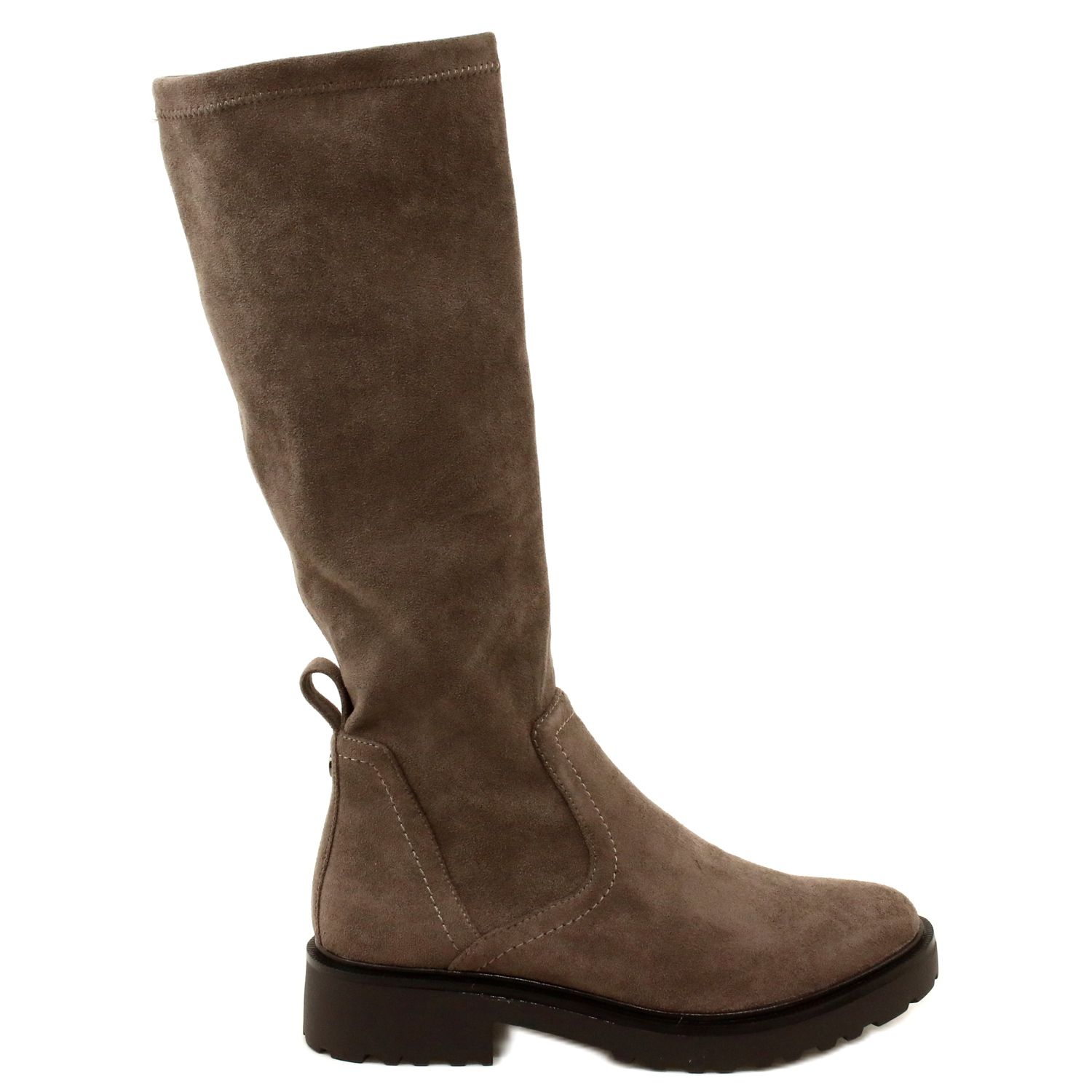 Stílusos kávézócsizma a kávézóban, nyújtott velúr húsos anyagból, amely rugalmasan alkalmazkodik a borjúhoz. A klasszikus vágás lekerekített orrával és egy stabil, 4 cm -es sarok miatt az alak vékonyabbnak tűnik, és a séta egész nap kényelmes marad.