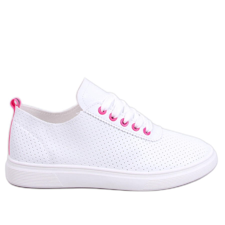 Gelman White/Fuksja női cipők - Fehér rózsaszín díszítéssel, amely azonnal felhívja a figyelmet. Alacsony, alacsony cipő, kerek orrú, egyesíti az alkalmi stílust és a kényelmet - tökéletes minden nap, séta a város körül vagy találkozik a barátokkal.