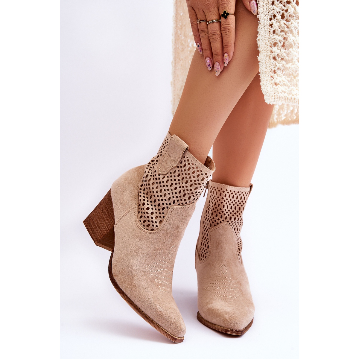 Fedezze fel a rendkívüli női velúr FB1 cowboy csizmát, amely tökéletesen ötvözi a klasszikus stílust a modern megjelenéssel. Ez a bézs színű magas sarkú bokacsizma tökéletes választás minden nő számára, aki szeretne kitűnni a tömegből. A boka felsőrésze ökológiai velúrból készült, áttört mintával és elöl finom varrással díszítve, ami egyedi karaktert ad nekik.