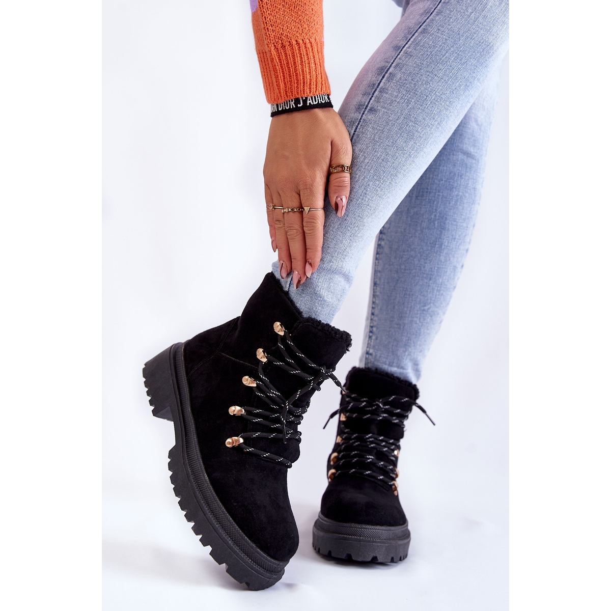 A csizma belsejét kényelmes lábbelitakaró szigeteli, a felsőrész végét kellemes tapintású báránybőr kabát díszíti, ami maximális kényelmet és meleget biztosít. A csizma lapos sarkú és hornyolt platformon van rögzítve, ami pozitívan befolyásolja a stabilitást és a biztonságot járás közben. Ezen kívül a sarokpult enyhén merevített, ami jobb tartást biztosít a lábnak.