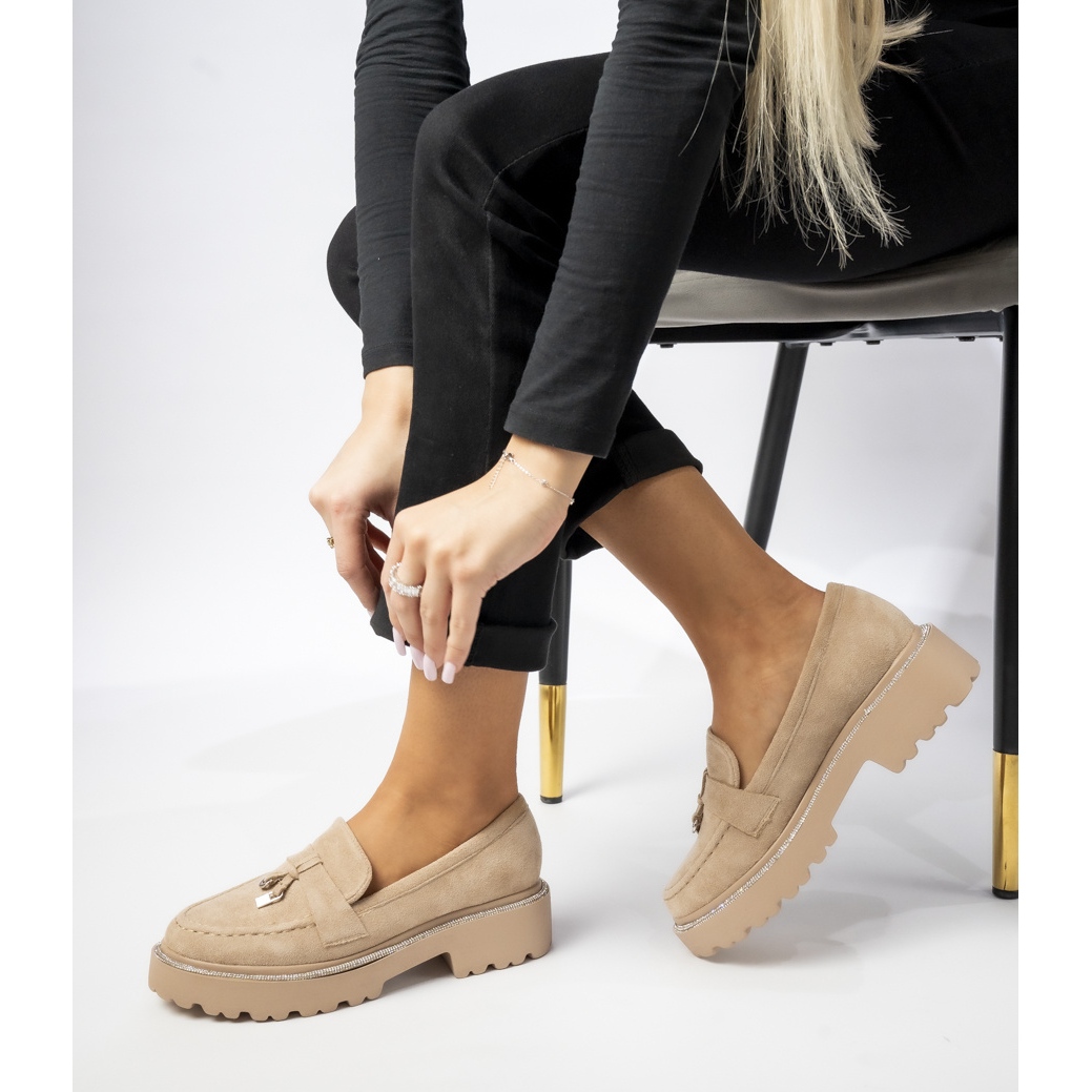 A magas színvonalú öko velúr bőrből készült, a cipők nemcsak tökéletesen illeszkednek a lábhoz, hanem a lágyságot is, amelynek köszönhetően még a hosszú távú viselet is öröm. A bézs színű vastag, újracsomagolt talp garantálja a különféle felületek stabilitását, ami napi és különleges alkalmakkor tökéletes választást jelent.