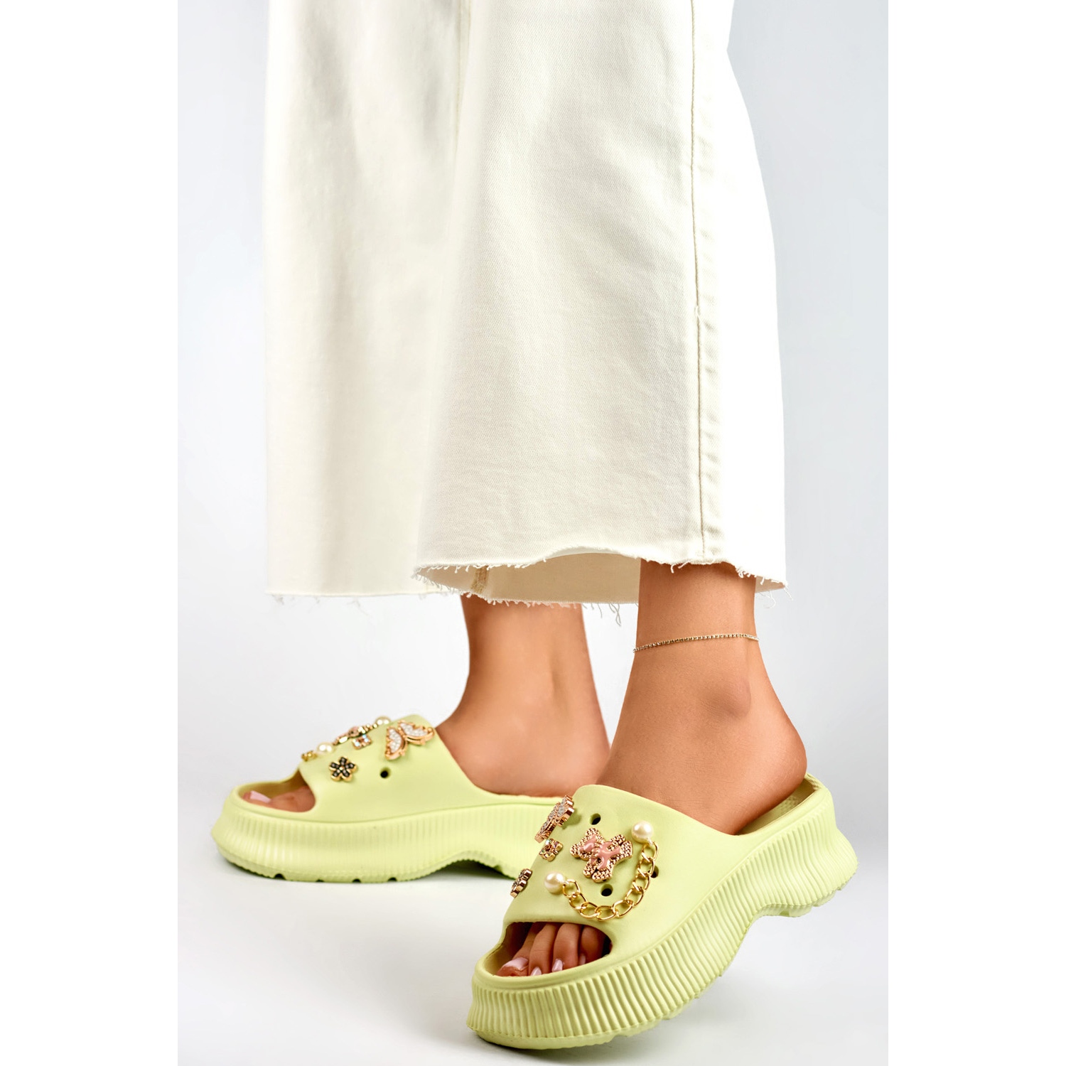 Ne hagyja ki a lehetőséget, hogy ezt a divatos akcentust hozzáadja a nyári szekrényéhez. Válassza ki a női világos zöld gumi szárnyokat dekorációkkal, és élvezze nemcsak a kényelmet, hanem az eleganciát is minden nap!