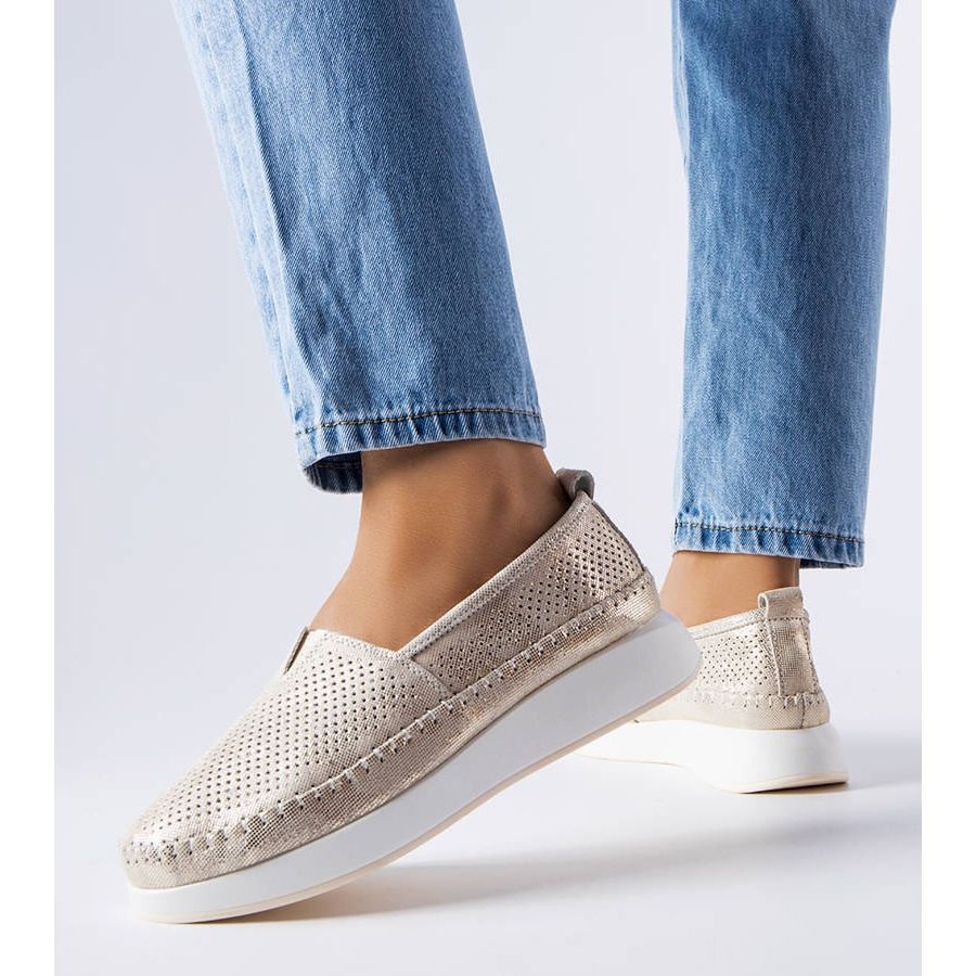 Elegáns és kényelmes Noruega cipő látványos, arany árnyalatban. Fényes, természetes nyílt bőrből készült bőrből kombinálják az eleganciát egy városi karakterrel - ideális a nyári stilizációkhoz, amikor a stílust hangsúlyozni szeretné és biztosítja a kényelmet egész nap.