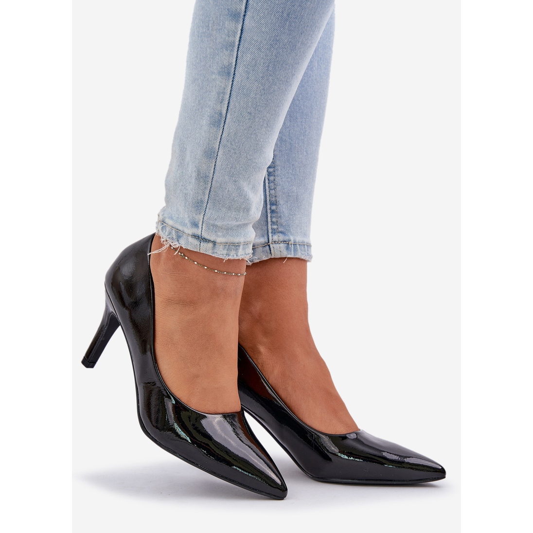 Fedezze fel az eleganciát és a stílust a fenyőfestékű bőrcsapokkal, fekete színben. Ezek a női szivattyúk kombinálják a klasszikus felületet a modern kialakítással, amelynek köszönhetően ezek tökéletesen kiegészítik a stilizációt. A 8,5 cm magasságú magas sarok csodálatosan hangsúlyozza az ábrát, és a hegyes orr egyedi karaktert ad nekik.