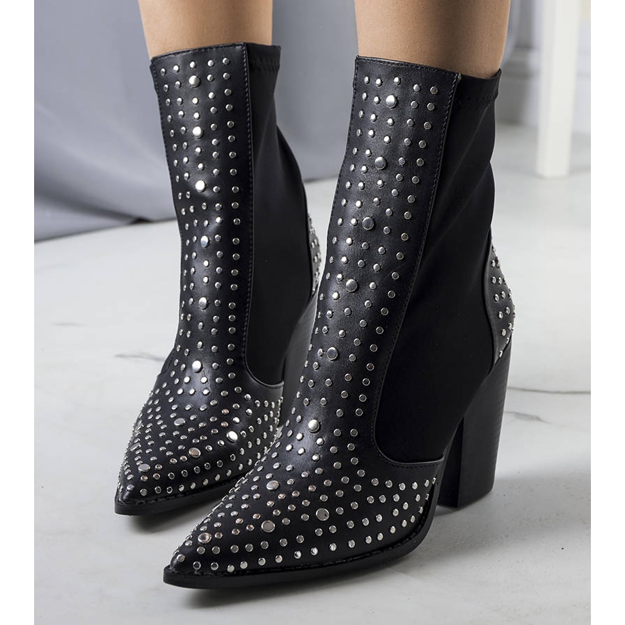 Fenomenális csizma, valamint a rock karakter és a nőies elegancia kombinációja. Az oszlopon lévő modell (9,5 cm) hegyes orrú és eléri a bokát (a felső magasság kb. 25,5 cm). A klasszikus fekete színű, kiváló minőségű ökológiai bőrből készült felső rész olyan fémcsapokkal volt díszítve, amelyek kifejező, divatos megjelenést adnak nekik.