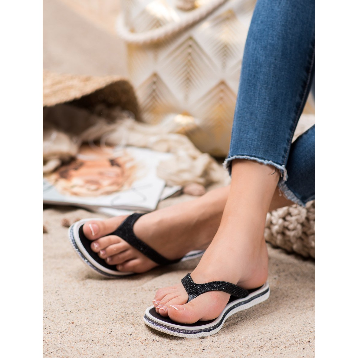 Fedezze fel a lenyűgöző stílust és kényelmet a Bona csillogó papucsokkal! Ezek az elegáns fekete papucsok tökéletes választás a meleg napokra, és számos hétköznapi stílushoz tökéletes kiegészítők. Univerzális színeiknek köszönhetően tökéletesen passzolnak mind a nyári ruhákhoz, mind a rövid rövidnadrágokhoz, és minden megjelenéshez adnak egy kis fényt.