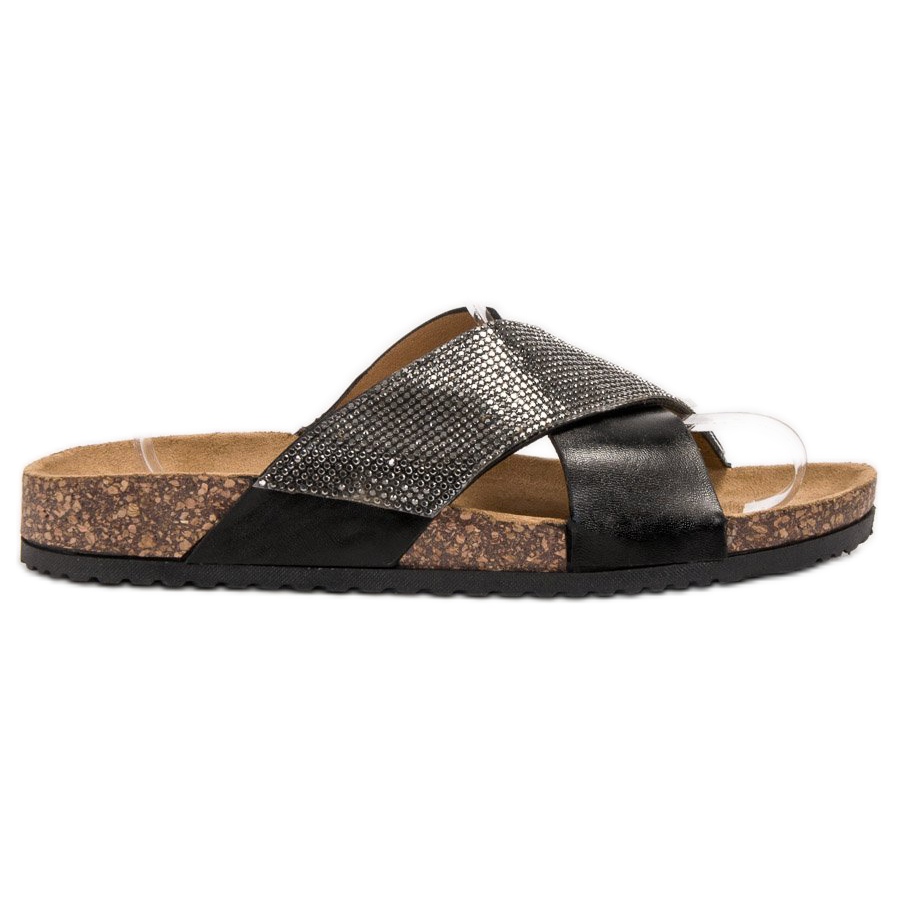 A részletekre való odafigyeléssel készült papucsokat dekoratív strasszokkal és strasszokkal különböztetik meg, amelyek eredeti megjelenést kölcsönöznek nekik. A fekete felület rendkívül univerzálissá teszi őket, és tökéletesen illeszkednek minden ruhába. Orrdoboz nélkül és nyitott sarokkal kiváló szellőzést és viselési kényelmet biztosítanak, tökéletesek a meleg tavaszi és nyári napokra.