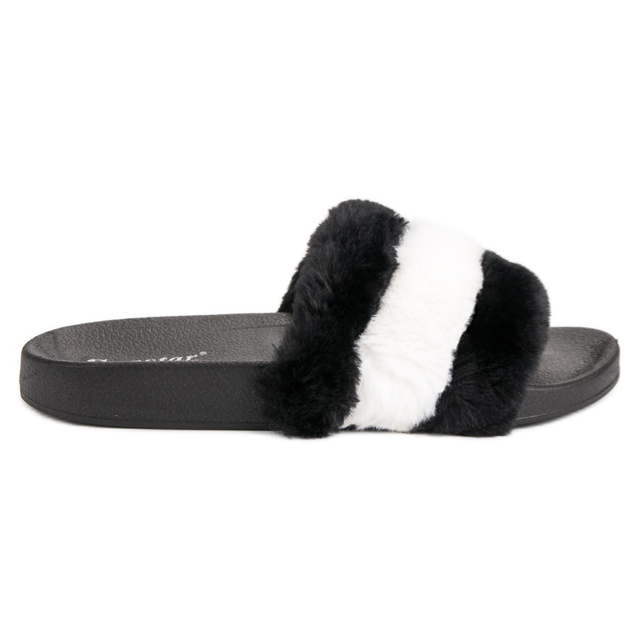 Seastar Flip-Flops With Fur, fekete, tökéletes választás azoknak a nőknek, akik fontosnak tartják a kényelmet és a stílust otthon. Ezeket a felcsúsztatható csúszdákat nem csak elegáns fekete színük, hanem eredeti, fehér és fekete csíkos szőrme is jellemzi, amely egyedi karaktert kölcsönöz nekik. Kiváló minőségű gumiból készültek, garantálják a tartósságot és a szilárdságot, így sokáig kitartanak.