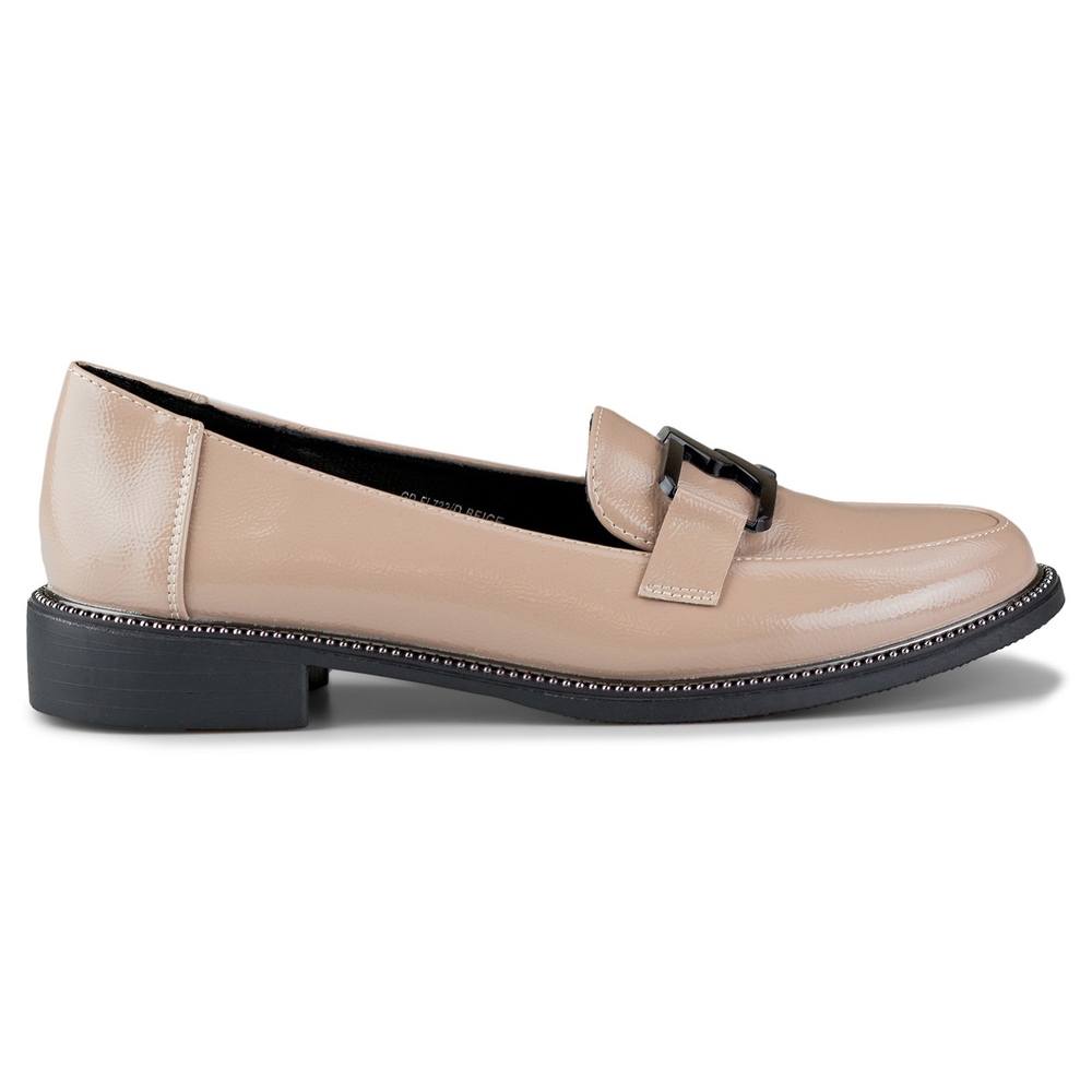 Elegáns, lakkozott női mokaszincipő, kombinálva a klasszikus vágást egy modern fényessel. Csúsztatva, egy sima talpon, finom, 2,5 cm -es peronnal, kerek orrral és természetes bőr betéttel - ideális irodai és városi stílusokhoz.