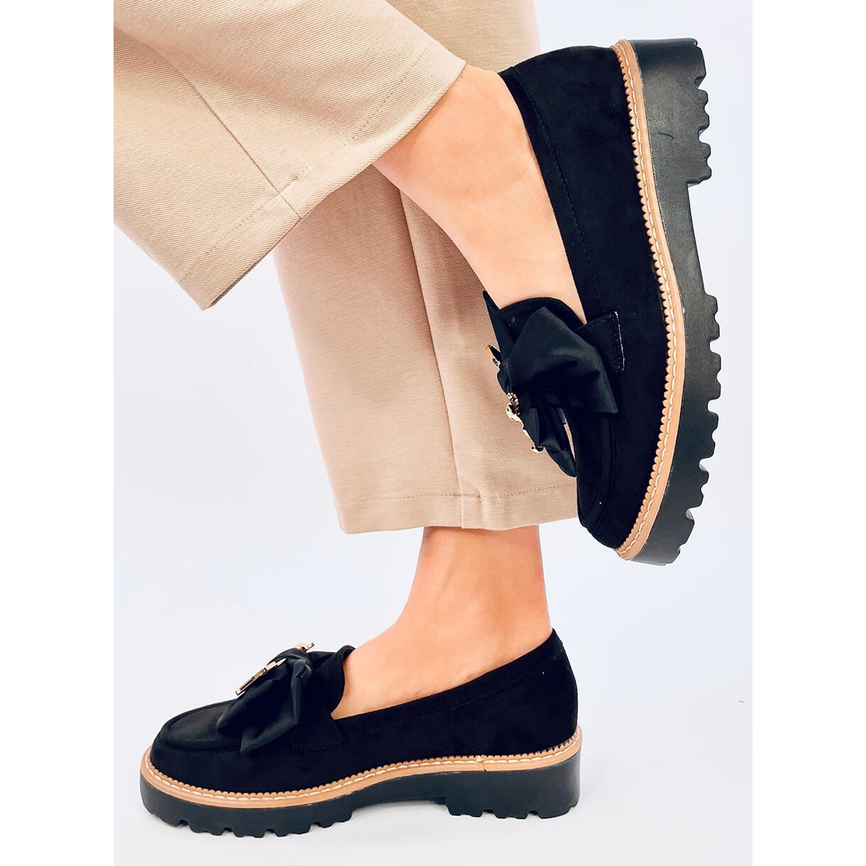 Ökológiai velúrból készültek, ezek a cipők nemcsak a szemét, hanem a környezetet is vigyázzák. A dekoratív íj bross és egy arany mackóval egyedülálló részlet, amely egyedi karaktert ad nekik. A klasszikus fekete szín univerzális, és könnyen kombinálhatja azokat a különféle stílusokkal, és a kerek orr egész nap kényelmet nyújt.