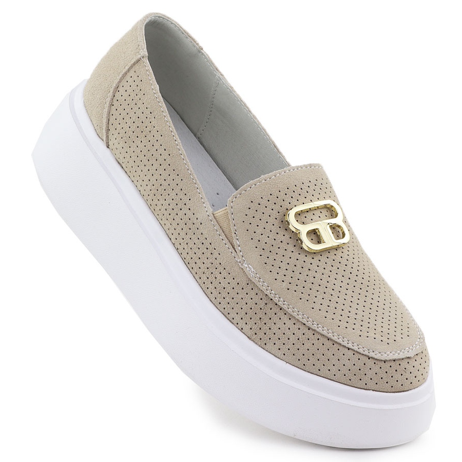 A mokaszinok belsejében egy ökológiai bőrből és természetes bőr betétből készül, amely egész nap biztosítja a kényelmet. A vastag, fehér talp nem csak a könnyedséget növeli, hanem tökéletesen ellentétben áll a felső bézs színével, így az egész modern és friss megjelenést biztosít.