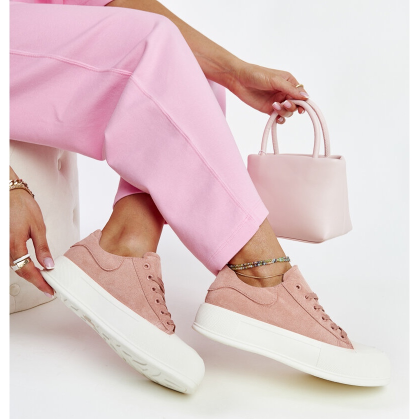 Bemutatjuk a rózsaszín Agathe platform tornacipőt, amely tökéletes kiegészítője lesz nyári ruhatárának. Kiváló minőségű ökológiai velúrbőrből készült stílusos cipők a divatos dizájnt és a maximális viselési kényelmet ötvözik. A gumibetéttel merevített kerek orrnak és a textilanyagból készült belső betétnek köszönhetően a tornacipő akár egész napos kényelmet biztosít.