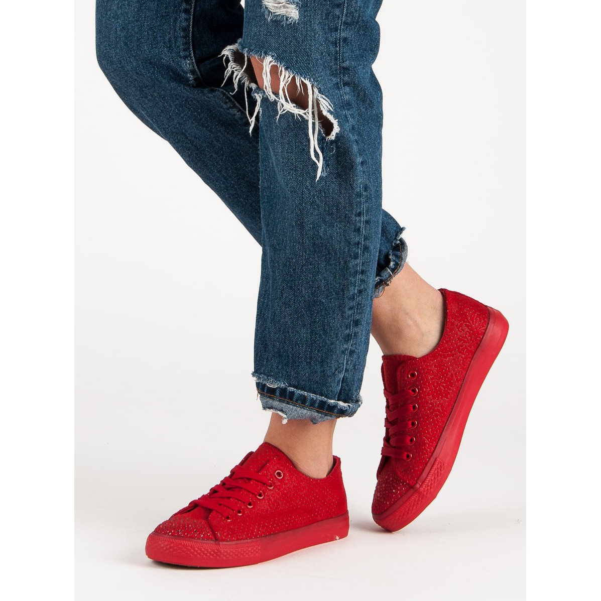 A Sport Red Sneakers with Crystals ideális ajánlat azoknak a nőknek, akik szeretnének egy kis színt és fényt adni mindennapi stílusuknak. Az intenzív vörös szín, amelyben készültek, tökéletesen felpezsdít minden hétköznapi ruhát, és a divatos kristályok az orránál kiemelik ezeket a cipőket a standard modellek közül.