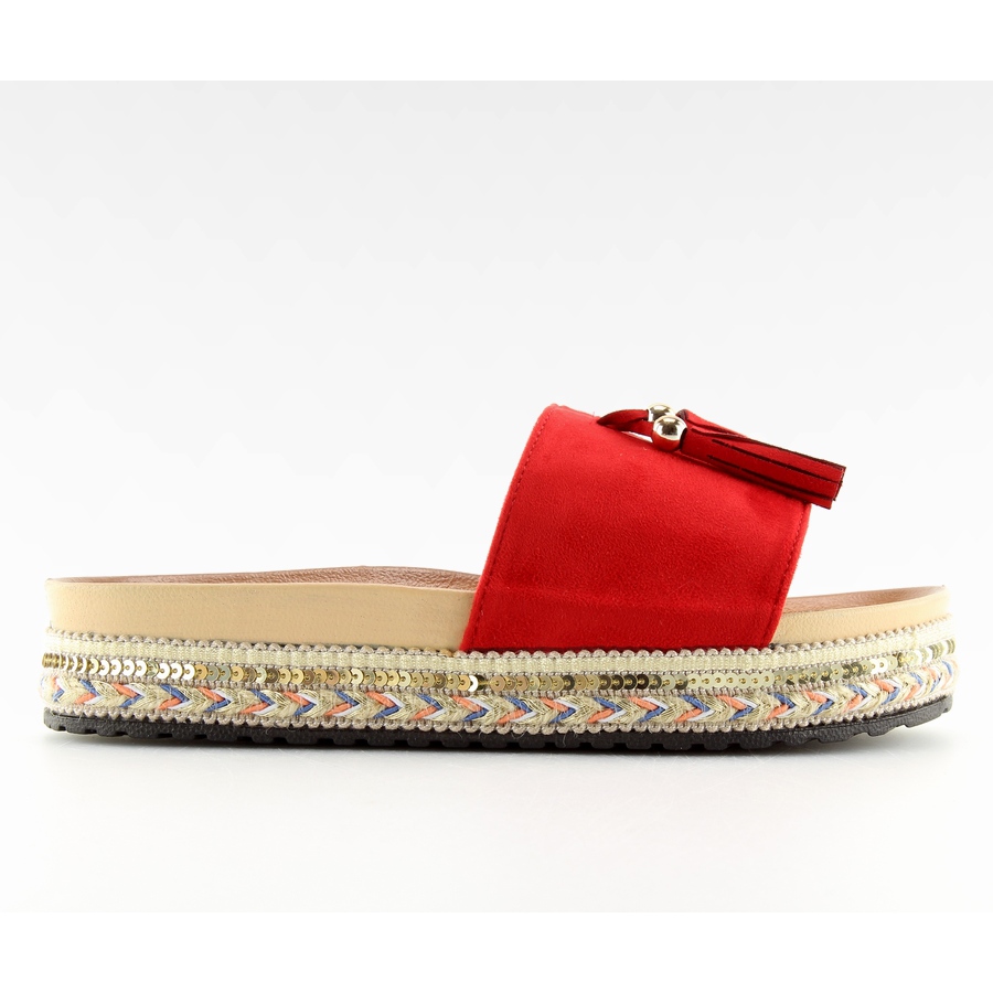 Készüljön fel a nyárra női piros LS-93 piros papucsokkal! Ezeket a divatos papucsokat a magas, profilozott talp jellemzi, amely nem csak stílust ad, de viselet közben is kényelmet biztosít. Egy pillantás elég ahhoz, hogy beleszeress a varázsukba - a talpon lévő eredeti díszítések és a bájos bojtok felkeltik a figyelmet, és egyedi karaktert kölcsönöznek a cipőknek.