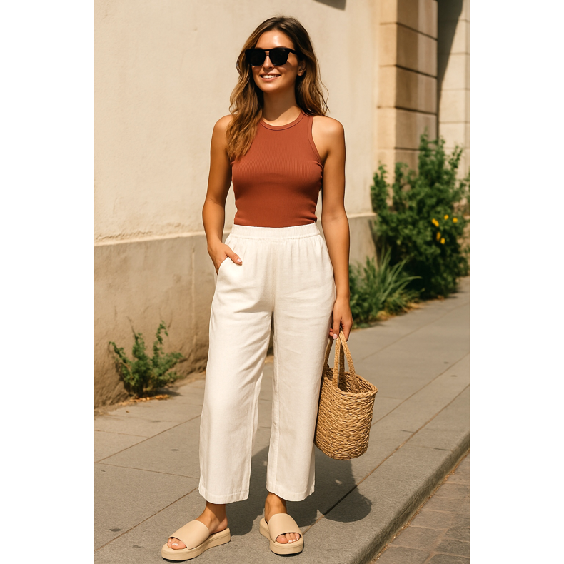 A bő szabású vászon nadrág fenomenálisan néz ki a platform fülekkel. Válassz fehér vagy krémszínű nadrágot, és párosítsd hozzá kontrasztos színű, testhezálló felsővel, például terrakotta vagy üvegzölddel. Adjon hozzá egy fonott táskát és nagy napszemüveget. Ez a stílus tökéletes ebédre egy étterem kertjében vagy egy nyári városi vásárra.