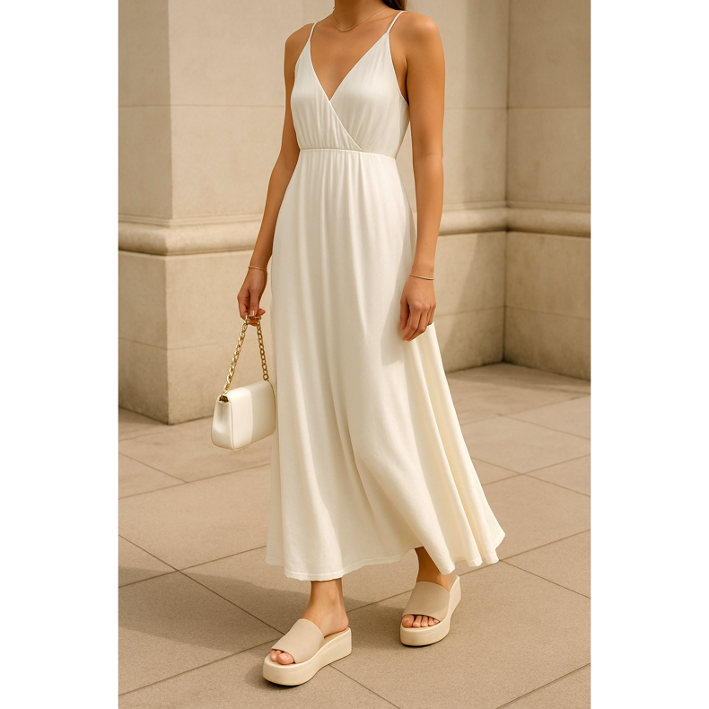Finom, légies anyagokból készült hosszú maxiruhához válasszon közepes platformon, visszafogott árnyalatú papucsokat. A fehér vagy bézs platformok tökéletesen passzolnak egy világos, monokróm ruhához. Adj hozzá kis arany ékszereket és egy kis lánctáskát. Ez a stílus tökéletes lesz egy nyári kerti esküvőre, egy kerti partira vagy egy elegáns szabadtéri partira.